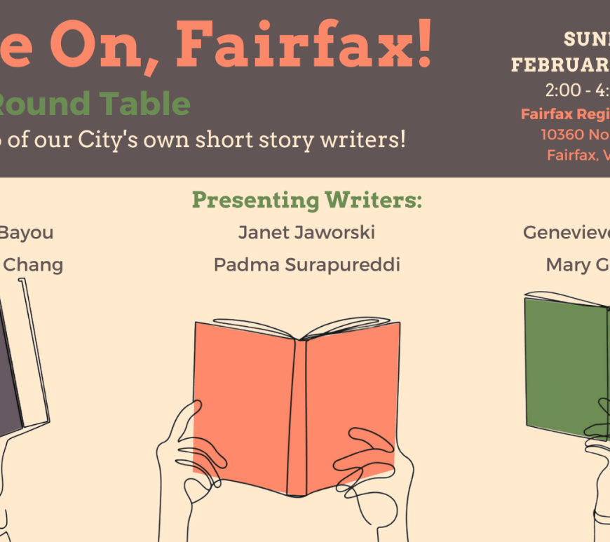 Write On, Fairfax!Genre: Short Stories Sunday, February 23, 2 – 4 pmLocation: City of Fairfax Regional LibraryFREE Presenters include: ABOUT THE PRESENTERS Aziza Bayou is an anthropologist, teacher, and PhD student in Cultural Studies at GMU. She writes in a variety of forms including ethnography, essays, poetry, short stories, and academic works. She is currently revising her first novel, A Human Figure, in which a teenage girl … Continue reading Write On, Fairfax!